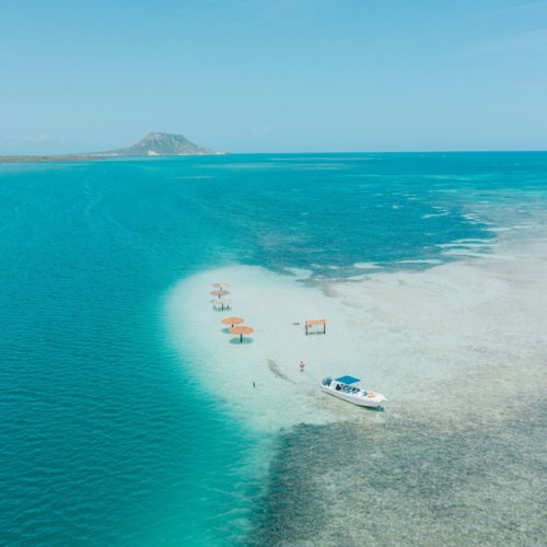 Banc de sable au milieu de l'océan, snorkeling et coucher de soleil.